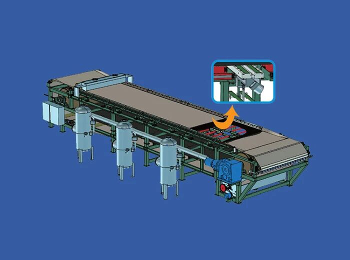 帶式真空過(guò)濾機(jī)是一種自動(dòng)化程度較高的新型固液分離設(shè)備,該設(shè)備由機(jī)架、真空箱、驅(qū)動(dòng)輥、壓布輥、糾偏輥、展布輥、料漿分布器、濾布糾偏裝置、濾布再生裝置和傳動(dòng)裝置、濾布等部件組成,是充分利用物料重力和真空吸力實(shí)現(xiàn)固液分離的高效分離設(shè)備。
