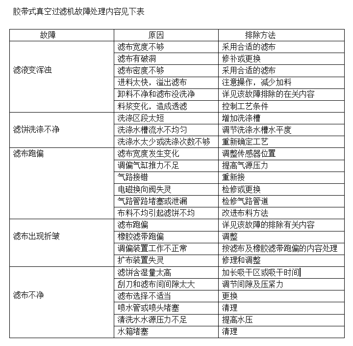 2.3.2濾餅卸凈后,將濾帶清洗1~2周,依次關(guān)閉淋洗液閥門→刷滾電機(jī)開關(guān)→濾帶再生水閥門→真空泵開關(guān)→主機(jī)電源開關(guān)→摩擦帶潤(rùn)滑水閥門→總氣源開關(guān)→氣泵開關(guān)→打開氣泵放水閥。